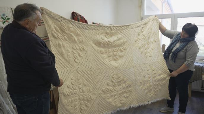 - Ovo je pleteno ćebe koje je radila moja pokojna strina, staro je 50 godina. Ručno je pleteno, sa neobičnom šarom, a takav rad postoji i kao šal - šal i ćebe u istoj mustri. Trebalo je dosta vremena da se isplete. Takve stvari danas više ne mogu da se nađu, ovo je unikat. Dobili smo ga od naše članice i jednog od osnivača udruženja, a danas su mi javili da je preminula. Ovo je divna uspomena koju ćemo čuvati generacijama. I zaista želimo i bilo bi nam drago da nam se priključi što više žena, mlađih devojaka da zajedno radimo na tome da se naša tradicija ne zaboravi i da stari zanati opstanu, poručuje Ana.