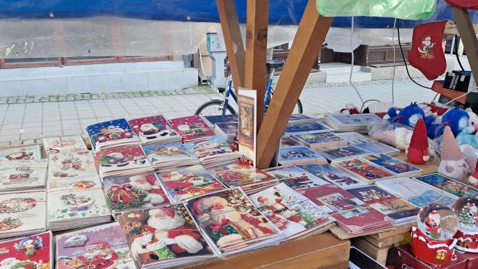 Novogodišnje tezge su postavljene u pešačkoj zoni u centru grada. I čestitke i baloni, novogodišnji ukrasi, ukrasne kugle, igračke veliki izbor za najmlađe.