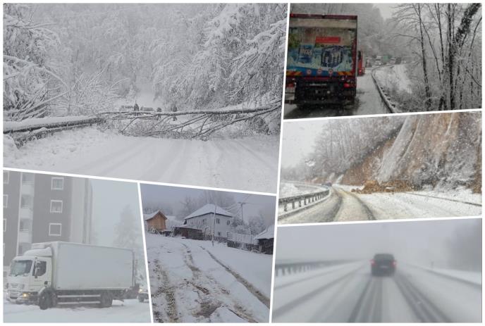 Na putu Perućac – Mitrovac na Tari od težine vlažnog snega ima palog drveća na putevima, dok na putu Požega – Kosjerić pored snega i ima odrona.