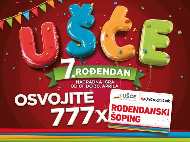 UŠĆE Shopping Centar će za svoj 7. rođendan, usrećiti čak 777 posetilaca. Sedmoro najsrećnijih imaće priliku da osvoji kartice sa po 250.000 dinara za šoping, njih 70 osvojiće vaučer na 5.000 dinara, a 700 posetilaca dobiće na poklon vaučer od 2.000 dinara.