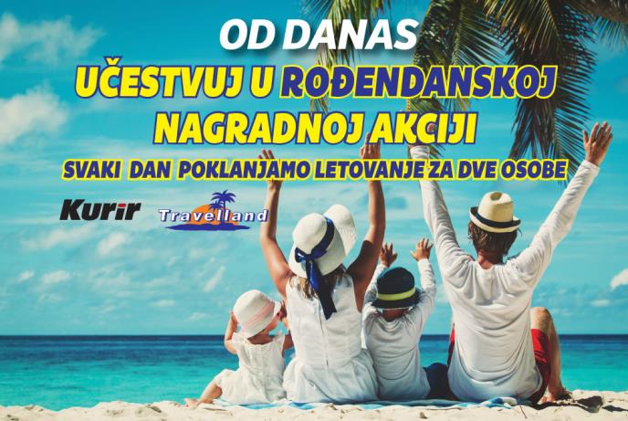 Od danas dnevne novine Kurir u saradnji sa turističkom agencijom Travelland organizuju veliku rođendansku nagradnu akciju u kojoj svaki dan poklanjaju letovanje za dve osobe, a kao glavnu nagradu letovanje za četvoro.