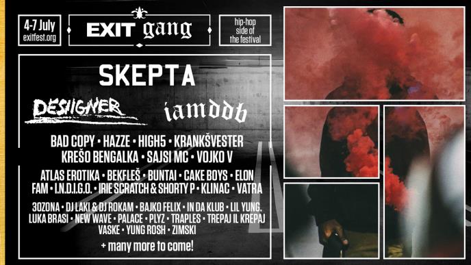 Nakon niza udarnih gitarskih bendova i najvećih zvezda elektronske muzike, EXIT će ovog leta okupiti i najveće hip-hop pleme uz dovoljno imena da proglase festival ovog muzičkog žanra na tvrđavi od 4. do 7. jula! Ovu postavu predvodiće britanski kralj rima, reper i aktivista Skepta, jedini MC koji je londonski zvuk ulice uspeo da popularizuje u Americi, što je potvrdio i planetarni megahit „Praise the Lord" koji je snimio sa A$AP Rockijem. Među njegovim fanovima javno su deklarisane brojne poznate ličnosti kao što su Mick Jagger sa kojim je radio zajednički singl ili Drake koji je istetovirao inicijale Skeptine izdavačke kuće “Boy Better Know”! Višestrukog dobitnika BRIT, BET, Mercury, MOBO i NME nagrada izuzetno cene i Pharrell Williams koji mu je producirao hit album "Konnichiwa", te Naomi Campbell sa kojom je bio u vezi. Sa britanskog ostrva stiže i fenomenalna IAMDDB, koju je i moćni BBC pozicionirao na listu izvođača čiji je zvuk obeležio prethodnu godinu, dok su njeni trap-jazz bengeri "Shade", "Drippy" i "Kurr£ncy", danas neizostavni na najboljim hip-hop i RnB žurkama. Za veliko nedeljno finale na glavnoj bini pobrinuće se uživo besprekorni Desiigner, tvorac najzaraznije hip-hop pesme u ovoj deceniji „Panda“, koja je dospela na sam vrh američke top liste i do danas izbrojala čak 1,3 milijarde YouTube pregleda!