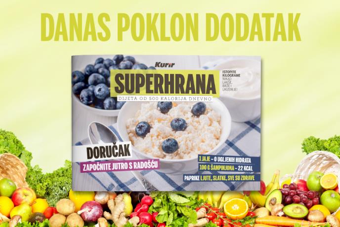 Započnite jutro s radošću uz Kurir. Danas poklanjamo dodatak SUPERHRANA - dijeta od 500 kalorija dnevno, sa ukusnim i zdravim predlozima za pripremu doručka. Sutra vas čeka dodatak sa predlozima za ručak.