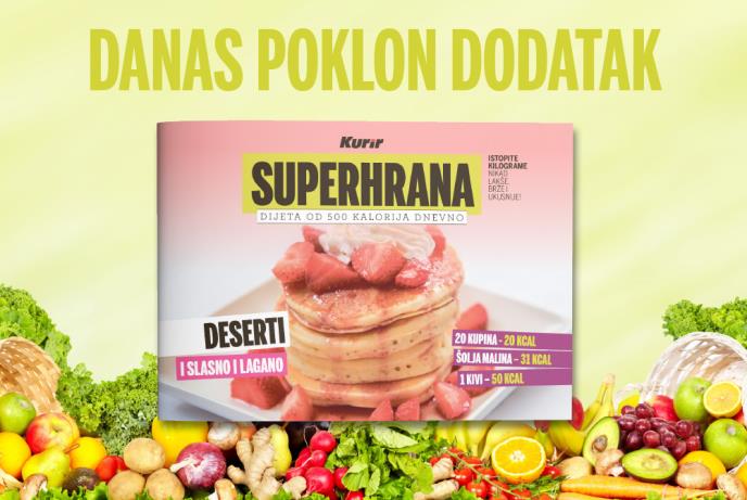 Dnevne novine Kurir danas poklanjaju dodatak SUPERHRANA sa slasnim i laganim predlozima za deserte koji ne goje! Istraživanja potvrđuju da recepti koje vam poklanjamo blagotvorno utiču na zdravlje.