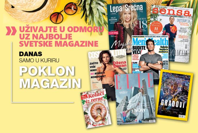 Danas uz svaki kupljeni primerak omiljene, dnevne novine Kurir čeka vas i POKLON - jedan od najpopularnijih svetskih magazina ili kuvar po izboru! Možete da birate između magazina: Cosmopolitan, Elle, Sensa, Men’s Health, National Geographic, Lepa i Srećna, ali i između najrazličitijih kolekcija kuvara!