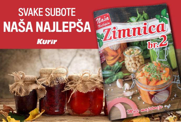 U sutrašnjem Kuriru čeka vas poklon dodatak Naša najlepša zimnica br. 2, u kojem ćete imati priliku da pročitate opšta uputstva za pripremu, kao i više od 40 recepata za zimnicu od voća i povrća. Neki od recepata koji vas čekaju su: slatko od bresaka, slatko od ruža, džem od pomorandže, džem od drenjina, pekmez od kiselih jabuka, kompot od jagoda, sok od kruške, sušeni paradajz, ajvar od cepkane paprike i sira, vranjanske paprike, peglana paprika, kornišoni, šargarepa u sirćetu i mnogi drugi.