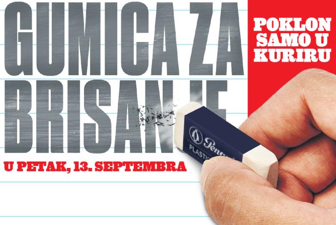 Dnevne novine Kurir u petak, 13. septembra, svakom čitaocu poklanjaju gumicu za brisanje. Gumica za brisanje je podjednako bitan deo pribora koliko i grafitna olovka. Pored brisanja slova i brojeva, gumica može da ima veoma bitnu ulogu u crtanju, jer se njome ne skidaju samo neželjene linije sa papira već se ona takođe koristi kao pomoćni probor za crtanje, tj. izvlačenje svetlih linija i površina sa osenčenih delova crteža. Gumica koju ćete dobiti na poklon uz Kurir je veoma kvalitetna i ne ostavlja tragove na podlozi.