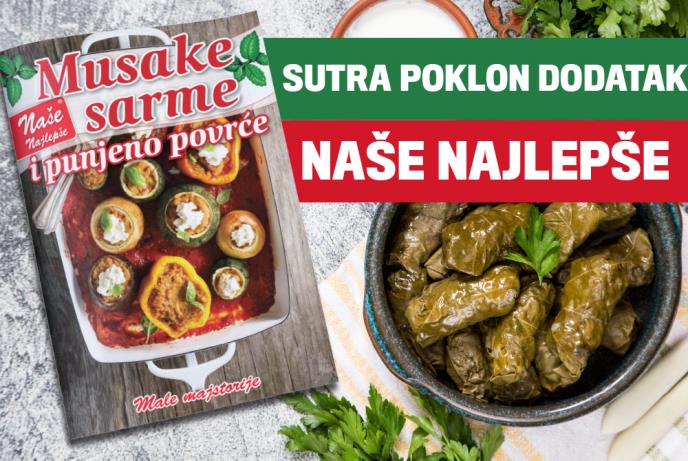 Dnevne novine Kurir sutra poklanjaju dodatak Naše najlepše musake, sarme i punjeno povrće sa više od 40 originalih recepata. Otkrićemo vam neke od recepata: musaka od pasulja, musaka od pohovanih tikvica, francuska musaka, musaka od kelja, sarma od kiselog kupusa, sarmice od blitve, posna sarma od slatkog kupusa, pohovane sarmice od kelja, sarmice od raštana, punjeni krompir, punjeni celer, punjeni paradajz, punjeni krastavci, rolnice od blitve, crni luk punjen mlevenim mesom, paprika punjena sirom i kobasicama, krompir sa pistaćima i mnogi drugi.