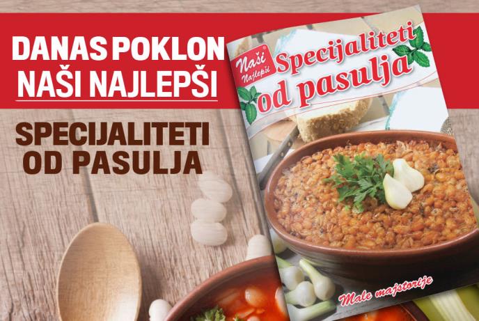 Dnevne novine Kurir svake subote poklanjaju dodak Naši najlepši. Danas ćete dobiti više od 40 recepata za specijalitete od pasulja kao što su: argantinske lazanje, humus od pasulja, kroketi od pasulja, gulaš sa pasuljem, musaka od pasulja, šolet, testenina sa pasuljem i spanaćem, piletina sa pasuljem i mnogi drugi.