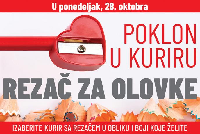 Svaki čitalac Kurira će u ponedeljak, 28. oktobra, dobiti na poklon REZAČ ZA OLOVKE. Rezač je dostupan u različitim bojama i oblicima, potrebno je samo da izaberete Kurir sa onim koji vam se najviše dopada.