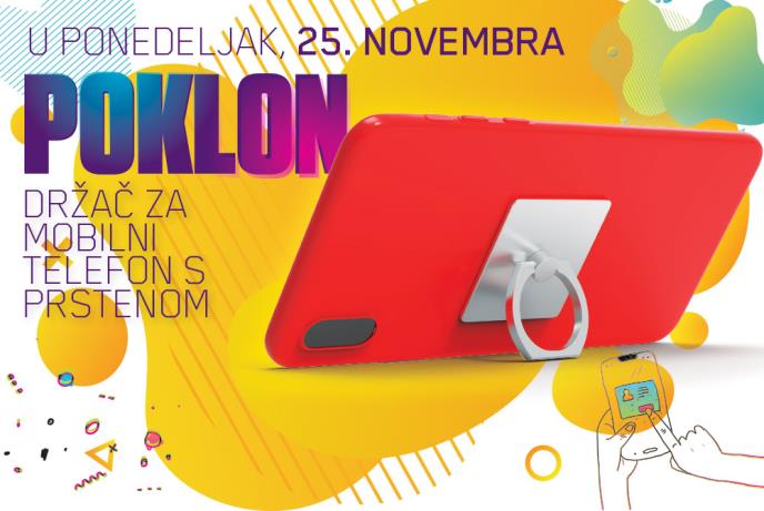 Dnevne novine Kurir pripremile su još jedan koristan poklon za sve čitaoce. U ponedeljak, 25. dovembra poklanjamo DRŽAČ ZA MOBILNI TELEFON S PRSTENOM. Veoma je jednostavan za korišćenje, samo ga zalepite na svoj mobilni. Držač može da se rotira za 360 stepeni i sprečiće da vam telefon ispadne iz ruke. Idealan je za gledanje video materijala, samo postavite telefon na ravnu podlogu i uživajte u omiljenom filmu ili seriji.