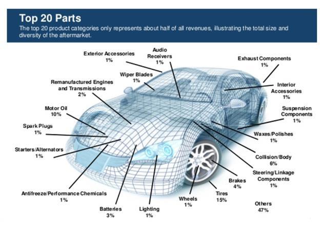 Svetsko tržište rezervnih delova, u automotive aftermarket segmentu, se za 2020. godinu procenjuje na oko 350 milijardi dolara. Godišnja stopa rasta (CAGR) je procenjena na oko 4.7% godišnje do 2025. godine. Automotive Aftermarket tržište obuhvata obuhvata različite proizvode, a neki od njih su: gume, svećice, sijalice, diskovi, kočione pločice, ulje, antifriz, tehničku hemiju, starteri i alternatori, filteri, amortizeri i drugi elemente vešanja, akumulatori, brisače itd.