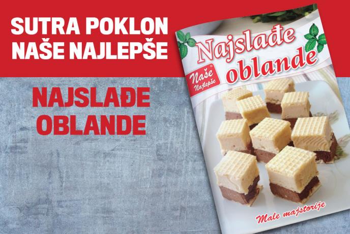 Sutra ćete uz Kurir dobiti na poklon dodatak NAŠE NAJLEPŠE NAJSLAĐE OBLANDE, sa više od 40 fenomenalnih recepata, kao što su: bajadera s oblandom, šah kocke, ledeni rolat u oblandi, cvetne kocke, kokosov užitak, marcipan oblande, grilijaš salama, oblande s marmeladom od kajsija, slani rolat u oblandi, kikiriki kuglice, susam štandlice i mnogi drugi.