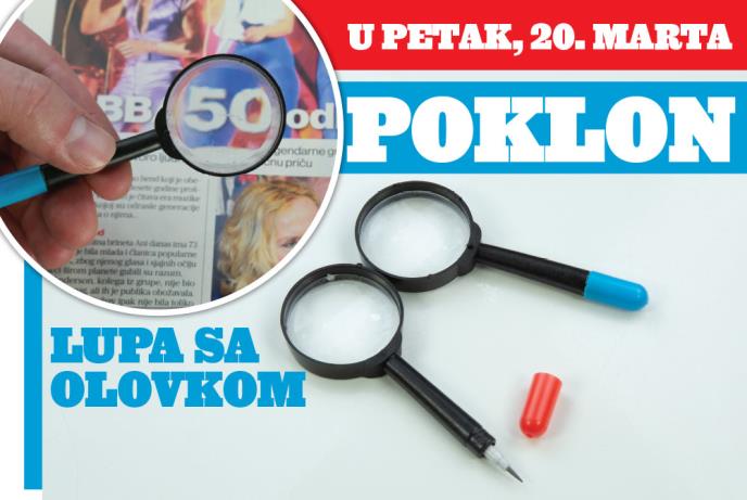 U petak, 20. marta, u dnevnim novinama Kurir čeka vas još jedan koristan poklon – LUPA SA OLOVKOM. Lupa je idealna za čitanje deklaracija, lekarskih recepata, sitnih slova u ugovorima ili za posmatranje sitnih predmeta koje želite da uvećate. Kompaktna je i zgodna za nošenje, tako da vam uvek može biti pri ruci. Sa donje strane nalazi se olovka, samo uklonite poklopac.