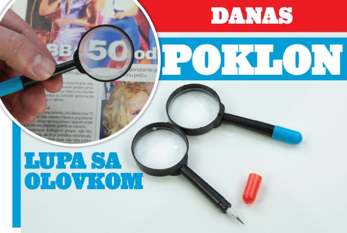 Danas ćete uz dnevne novine Kurir dobiti na poklon – LUPU SA OLOVKOM. Lupa je idealna za čitanje deklaracija, lekarskih recepata, sitnih slova u ugovorima ili za posmatranje sitnih predmeta koje želite da uvećate. Kompaktna je i zgodna za nošenje, tako da vam uvek može biti pri ruci. Sa donje strane nalazi se olovka, samo uklonite poklopac.