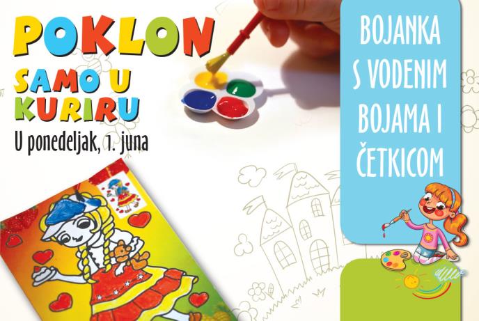 Dnevne novine Kurir spremile su sjajan poklon za najmađe. U ponedeljak, 1. juna, dobićete BOJANKU S VODENIM BOJAMA I ČETKICOM. U mini setu koji poklanjamo, dobićete bojanku, paletu, četiri vodene boje i četkicu. Deca će se satima zabavljati, dok će u isto vreme biti u mogućnosti da izraze svoju kreativnost.