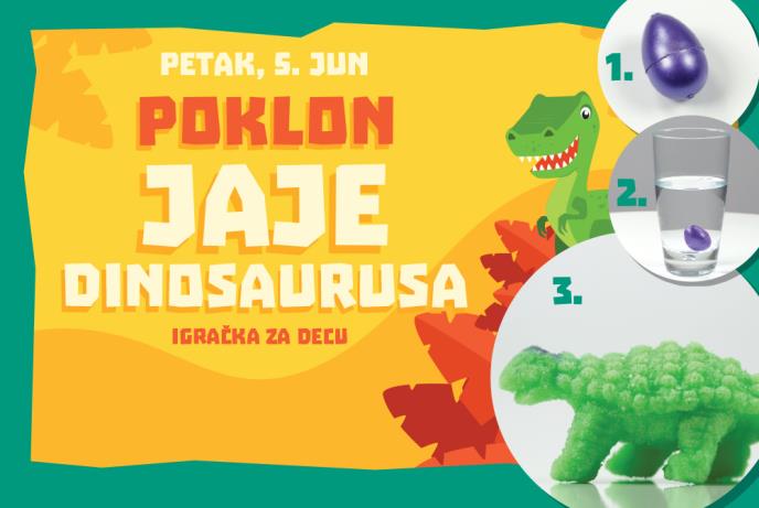 Uz svaki primerak dnevnih novina Kurir u petak, 5. juna, dobićete da poklon igračku za decu - JAJE DINOSAURUSA. Kada ga otvorite, sve što je potrebno da uradite jeste da sipate vodu u providnu čašu i potopite jaje kako bi vaše dete moglo da prati proces pucanja i sa nestrpljenjem očekuje da se dinosaurus izlegne.