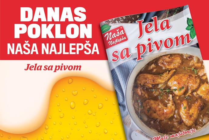 Danas ćete u poklon dodatku Naša najlepša JELA SA PIVOM dobiti recepte za ukusna jela kao što su: gulaš s pivom i krompirom, svinjski paprikaš na pivarski način, pileći bataci s kimom i krompirom, pileće džigerica dinstana u pivu, svinjski file u lisnatom testu, svinjetina s krastavcima u pivu, pivski fijaker gulaš i mnoga druga.