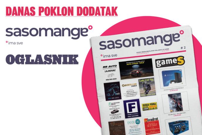 Danas vas u novom, redizajniranom Kuriru čeka poklon dodatak SASOMANGE oglasnik. U njemu ćete naći više od 500 besplatnih malih oglasa na 16 strana. Naći ćete oglase za prodaju ili kupovinu automobila i opreme za automobile, nekretnina, mobilnih telefona, opreme za računare i mnoge druge.