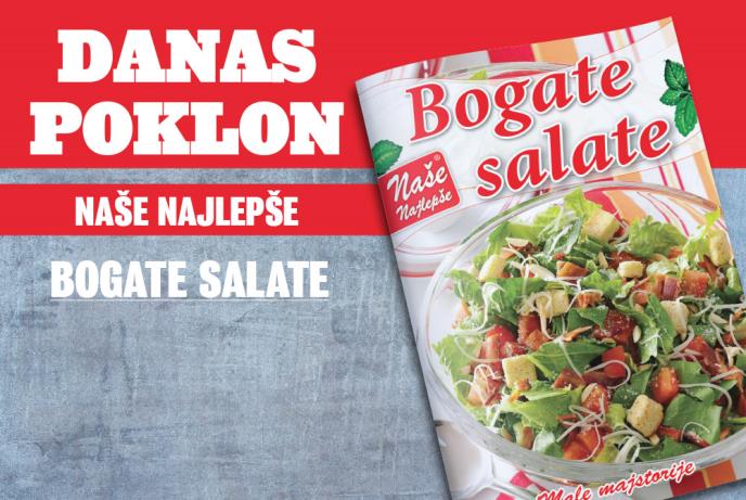 Danas ćete u poklon dodatku Naše najlepše BOGATE SALATE dobiti recepte kao što su: kikiriki salata s piletinom, salata s ćuretinom i mladim sirom, proteinska salata, salata od celera i šunke, salata od ćurećeg mesa s aromatičnim sirom, narandžasta salata, salata od šargarepe, mediteranska salata, salata sa šampinjonima, letnja salata od boranije i mnoge druge.