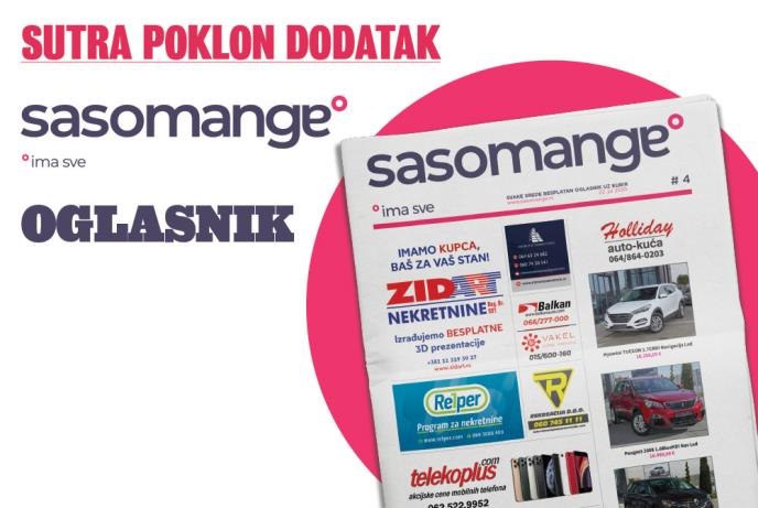 U poklon dodatku, Sasomange oglasnik, koji ćete sutra dobiti na poklon uz dnevne novine Kurir čeka vas više od 500 besplatnih malih oglasa na 16 strana. Pronađite oglase za kupovinu ili prodaju automobila, nekretnina, malih kućnih aparata, mobilnih telefona, računara i drugih stvari koje su vam potrebne ili želite da ih prodate.