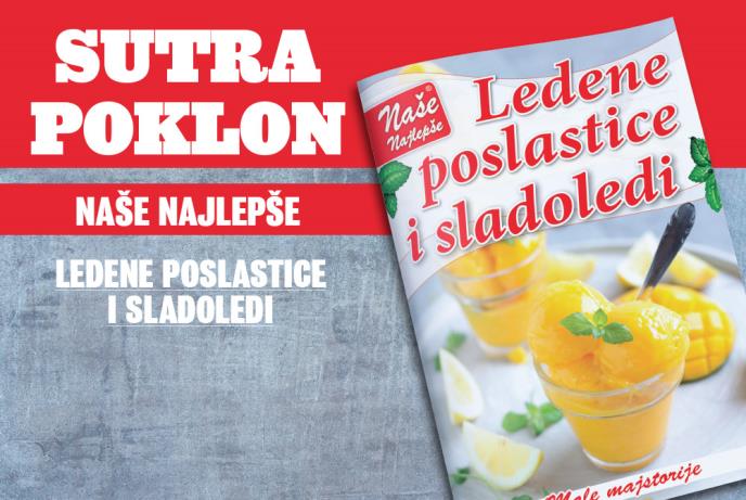 Sutra ćete uz dnevne novine Kurir dobiti poklon dodatak Naše najlepše LEDENE POSLASTICE I SLADOLEDI! Čekaju vas fenomenalni recepti za ukusne poslastice kao što su: bavarski krem, jednostavni tiramisu s breskvama, mramorna torta, parfe sladoled, mus od mlečne čokolade, krem od limete i maskarpone sira, sladoled mešano voće, hladne čokoladne kugle, malina sorbet, čokoladne banane sa sladoledom i mnoge druge.