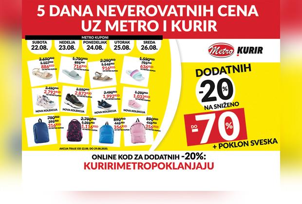 Od subote, 22. do srede, 26. avgusta, na naslovnoj strani svakog izdanja dnevnih novina KURIR biće objavljen METRO KUPON pomoću kojeg čitaoci ostvaruju DODATNIH -20% na kompletan asortiman snižen do čak -70% i na NOVU KOLEKCIJU.