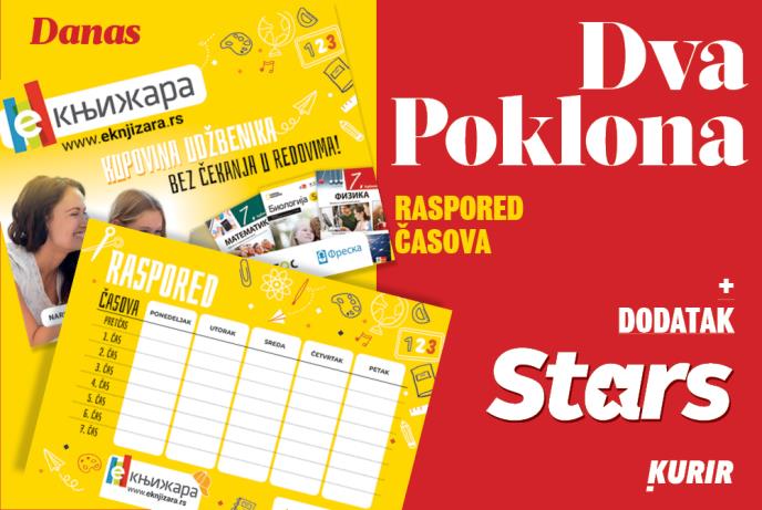 Danas ćete uz dnevne novine Kurir dobiti dva poklona: RASPORED ČASOVA plus dodatak STARS. Raspored časova poklanjamo u saradnji sa E-knjižarom, povodom početka školske godine.
