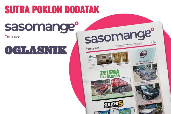 Sasomange je novi onlajn oglasnik, koji se sastoji od internet portala i aplikacija, dostupnih i za iOS i za Android platforme, a svake srede uz dnevne novine Kurir dobijate na poklon selekciju besplatnih malih oglasa. Celokupnu ponudu oglasa možete pronaći na Sasomange.rs, gde vas čeka preko 390.000 aktivnih oglasa u više od 90 kategorija i potkategorija. Sasomange – jedno mesto na kom ima sve!
