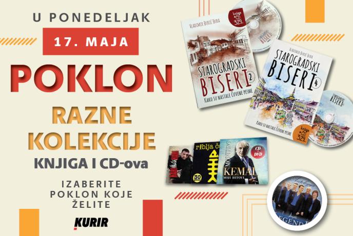 Dnevne novine Kurir u ponedeljak, 17. maja, svojim čitaocima poklanjaju razne kolekcije knjiga i CD-ova. Tu su: Smešna knjiga za decu, kompilacije knjige i CD-a Starogradski biseri, kao i CD kompilacije: Pesme iz Srbije, Legende antologija, Riblja čorba hitovi, Hari Mata Hari, Halid Bešlić - best of, Kemal Monteno - best of, Šaban Bajramović - best of, Smak - best of, Najlepša srpska kola, Pesme iz Bosne, Željko Samardžić – žurka ili Zlatne trube Guče. Potrebno je samo da izaberete Kurir sa poklonom koji želite!