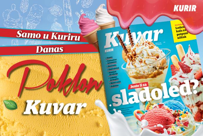 Danas ćete uz dnevne novine Kurir dobiti na poklon KUVAR:Jeste li za SLADOLED? Ko može da odoli ovoj poslastici kad temperatura postane previsoka! Još ako je domaći u pitanju, radosti nema kraja. Ovo baš prija - ledena kafa za potpuni užitak! Naučićemo vas kako da pravite razne vrste sladoleda kao što su: kasato, fantastični kremisimo, straćatela, gusti mledčni, sladoled o višanja, ledenko na štapiću, moćni voćni, kafisimo i mnoge druge. Plus savet: Uštedite svaki dinar! Namirnice koje nisu za kantu za smeće!