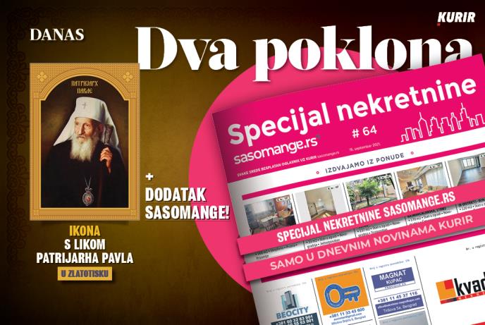 Dnevne novine Kurir poklanjaju IKONE S LIKOVIMA SRPSKIH PATRIJARHA! Danas ćete dobiti IKONU S LIKOM PATRIJARHA PAVLA u zlatotisku i dodak specijal nekretnine SASOMANGE.RS - oglasnik za sve nekretnine u Srbiji!