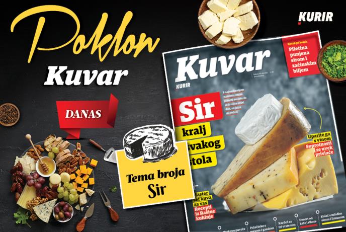 Dnevne novine Kurir danas svim čitaocima poklanjaju KUVAR. Tema broja je: SIR kralj svakog stola! S najomiljenijom namirnicom na planeti možete da se družite svaki dan, od jutra do večeri. Uparite ga sa vinom jer - suprotnosti se uvek privlače.