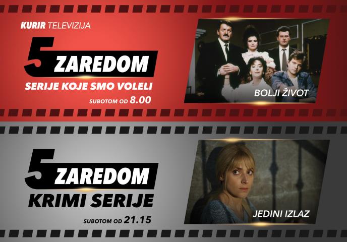 Sve propuštene epizode popularnih serija “Bolji život” i “Jedini izlaz” imaćete priliku da pogledate danas na Kurir televiziji. Serija koju je gledala cela bivša Jugoslavija i koja je ostavila neizbrisiv trag na mnoge generacije emituje se na Kurir televiziji u terminu rezervisanom za "Serije koje smo voleli" radnim danima od 10 časova, a danas od 8 časova u “5 zaredom” imaćete priliku da pogledate sve propuštene epizode.