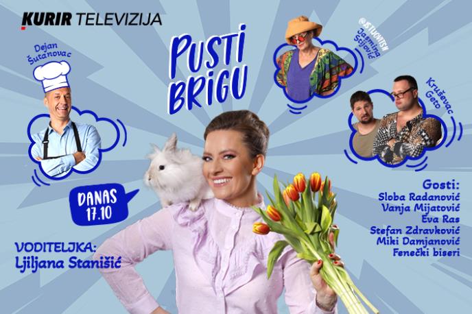 Danas u 17.10 časova na Kurir televiziji očekuje vas novo izdanje emisije "Pusti brigu" sa voditeljkom i novinarkom Ljiljanom Stanišić. Dobra zabava, sjajna atmosfera i odlični gosti svake nedelje su zagarantovani, kao i dobra muzika i vrhunski specijaliteti Dejana Šutanovca.