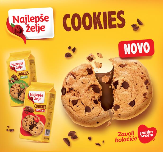 Najlepše želje napravile su iskorak u slatkoj kategoriji i sa velikim zadovoljstvom predstavile – Najlepše želje Cookies. Ova inovacija brenda Najlepše želje oduševiće sva vaša čula, jer zadovoljava kriterijume čak i onih najzahtevnijih sladokusaca. Prepoznatljivi ukus omiljene čokolade sada je dostupan u formi hrskavog biskvita bogato posutog komadićima prave čokolade. Pored toga, neodoljivi Najlepše Želje Cookies obogaćeni su čokoladnim, odnosno noisette punjenjem i idealni su za sve one koji vole da uživaju u proverenom i nezamenljivom ukusu Najlepše želje čokolade na potpuno nov način.
