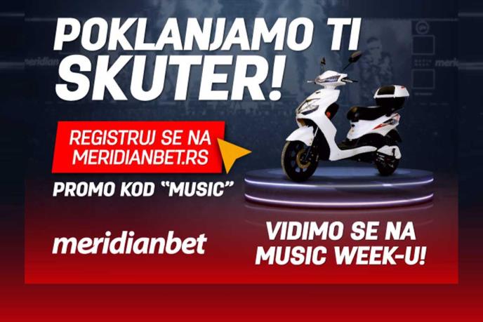 Kao jedan od vodećih brendova u industriji zabave i igara na sreću, Meridianbet je odlučio da obraduje sve posetioce Music Weeka bogatim zabavnim programom, poklon iznenađenjima, a spremne su i posebne nagrade – svako veče, Meridianbet će dodeljivati najnoviji Max Eagle 2023 skuter! Da biste iskoristili ovu neverovatnu ponudu, sve što treba da uradite jeste da se registrujete na sajtu meridianbet.rs.