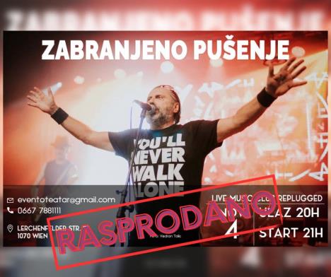Za koncert koji će Zabranjeno pušenje održati ovaj vikend, u subotu u Beču, nema više dostupnih ulaznica. Koncertom u bečkom klubu Replugged Pušenje nastavlja ovogodišnji niz rasprodanih i izuzetno posjećenih nastupa.