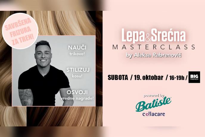 Kroz kombinaciju teorije i prakse, "Lepa&Srećna Masterclass by Aleksa Rabrenović powered by Batiste", uz podršku brenda Collacare, vodi vas kroz proces stilizovanja kose u svakoj prilici. Ali, to nije sve! Pridružite nam se na Aleksinoj radionici, a potom se prijavite za takmičenje - zajedno ćemo praviti frizure uz dragocene trikove koje je pokazao! Sve učesnice takmičenja dobiće goodie bag. Stručni žiri u sastavu Mr. Hair Aleksa Rabrenović, predstavnik generalnog sponzora Batiste, i glavna i odgovorna urednica magazina "Lepa&Srećna", Žaklina Milenković, svečano će proglasiti tri najbolje frizure, pobednici, drugom i trećem mestu slede vredne nagrade!