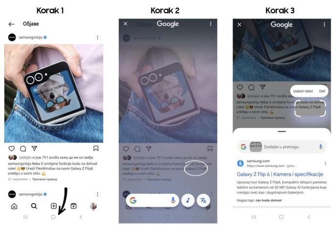 Circle to Search* je funkcija na Samsung pametnim telefonima koja vam pomaže da brzo pretražite na telefonu ono što vidite na ekranu, bez obzira na to da li se radi o tekstu, fotografiji ili video zapisu. Zadržite Dugme početak (Home button), zatim zaokružite konkretu reč ili objekat prstom ili S-pen olovkom i pokrenućete Google pretraživanje, a samim tim i dobiti rezultate u sekundi. Pratite korake sa sledećih fotografija: