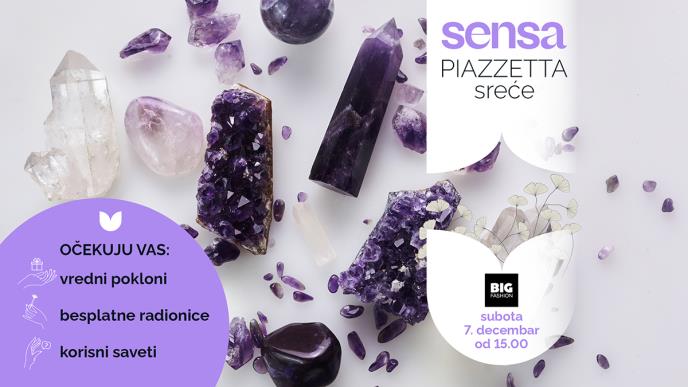 S radošću vas pozivamo da nam se pridružite u subotu, 7. decembra, od 15 časova u Big Fashion tržnom centru i zakoračite u svet inspiracije, radosti, moćnih energija i budućnosti. Kao i svaki put do sada, na Sensa Piazzetti sreće očekuje vas program koji će vam razgaliti dušu, otvoriti srca i ispuniti vas radošću u mesecu praznika i pozitivne energije.