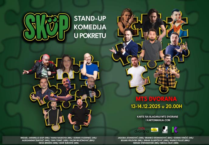 Smeh ne poznaje granice, a upravo to dokazuje najveći regionalni festival stand-up komedije – SKUP, na kom će publika od količine humora doslovno pasti sa svojih stolica! Na jednom mestu dva uzastopna dana 13. i 14. decembra, okupiće se komičari iz svih bivših jugoslovenskih republika, što ga čini jedinstvenim događajem na ovim prostorima. Nikada do sada publika nije imala priliku da na jednoj sceni doživi ovoliko različitih stilova, humora i energije. Kupovina karata je na mtsdvorana.rs i blagajni mts Dvorane.
