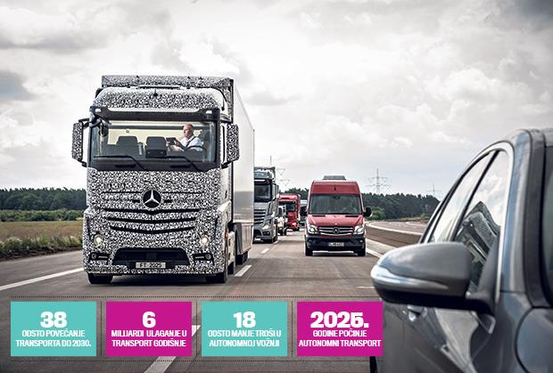 Auto-pilot će potpuno zaživeti do 2025. godine, a do tada će ga „Mercedes“ postepeno uvoditi na ulice. - Najbolji način da dođemo u budućnost jeste da je izmislimo - poručili su iz „Mercedesa“, koji je jedini razvio sistem auto-pilota za kamione, čime je dokazao dominaciju u oblasti transporta.