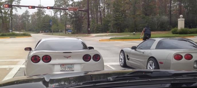 Neverovatan snimak Ševi Korvete C5 i Korvete C6 koji čekaju da se upali zeleno svetlo na semaforu kako bi počeli da se trkaju u predrgađu Hjustona, Teksas.