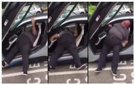(VIDEO) DEBELJUCA U PROBLEMU: Borba da izađe iz spuštenog BMW-a postala je hit na internetu!