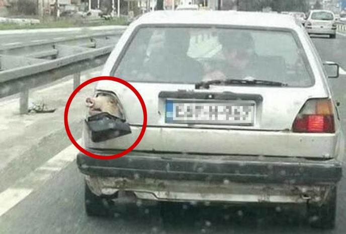 Ostavljamo našim čitaocima da zaključe da li je prase samo izbilo jedno zadnje svetlo kako bi došlo do vazduha (ili pak komfora), ili se možda vozač dosetio verovatno najluđeg rešenja ikada - da skine jedno zadnje svetlo i kroz taj otvor izbaci praseću glavu!