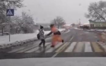Na snimku se vidi dete koje prelazi preko pešačkog, pošto se jedan vozač propisno zaustavio. S druge strane, radnik komunalnog preduzeća prelazi ulicu u suprotnom smeru, ali odjednom počinje da trči ka detetu.