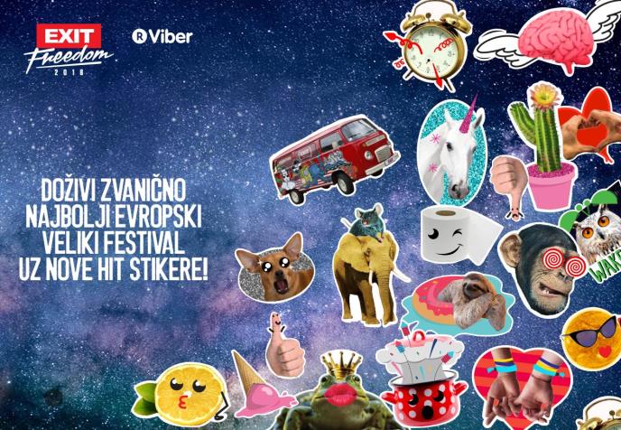 Za svoj osamnaesti rođendan koji se tradicionalno obeležava 29. juna, već treću godinu zaredom EXIT poklanja besplatne Viber stikere u saradnji sa najpopularnijom komunikacijskom aplikacijom u regionu! EXIT, kao prvi festival u svetu koji je izbacio svoje Viber stikere, danas se po broju od preko 1,1 milion fanova na ovoj komunikacijskoj platformi, nalazi u društvu najvećih svetskih brendova, u našem regionu je bez premca u odnosu na druge popularne brendove, kao što su sportski klubovi, telekomunikacijski provajderi i drugi. Ove godine, stikera je više nego ikad pre, pa će čak 34 neodoljive kombinacije fotografija i ilustracija biti dostupni za preko milijardu Viber korisnika širom sveta! Da će ove godine EXIT stikeri biti još popularniji nego pre, najbolje govore statistike iz prethodnih godina, kada je preko tri miliona korisnika iz čak 174 zemlje sveta preuzelo sve dosadašnje stikere i poslalo ih preko 30 miliona puta!
