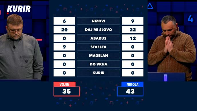 Prva asocijacija u igri "Kurir" ostala je nerešena, takmičari nisu mogli da pogode da se iza pojmova krije reč "bogatstvo" dok je Nikola rešio svoju asocijaciju i tako ubedljivo pobedio svog protivnika.