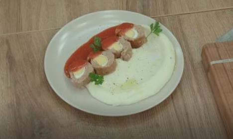 Priprema: Da se ne bi osećao luk pod zubima, najvažnije je iseći ga što sitnije. Beli i crni luk se dodaje u mleveno meso. Peršun se isecka sa stabljikama, jer se u njima nalaze vitamini i aroma, pa se doda u smesu sa mlevenim mesom. Nakon toga, u smesu dodati i jedno celo jaje i biber i so. Smesa se ujednači. U smesu se mogu dodati i prezle kako bi pokupile višak vlage. Smesa mesa se postavlja na foliju i preko njega se poređaju jaja sečena na pola. Sve se to urola i zamota u foliju. Krajevi folije se zavrnu u "kobasicu" i ubace u prethodno zagrejanu rernu na 250 stepeni. Nakon 10 minuta temperaturu smanjiti na 150. Servirati uz pire i paradajz sok.